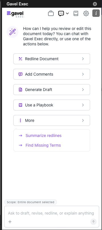 This Quick Action takes you to your Playbooks Tab for quick access to your Playbooks for redlining throughout the contract or document.