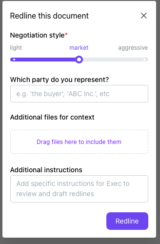 - Additional Files: Add files such as previous contracts, other context documents to give the Redlining Agent more information on your contract styles and needs.