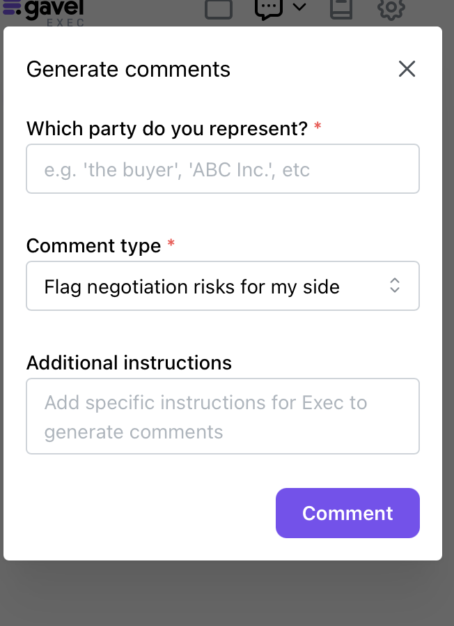 - Representation: Choose the party stance you would like the Commenting Agent to review from.