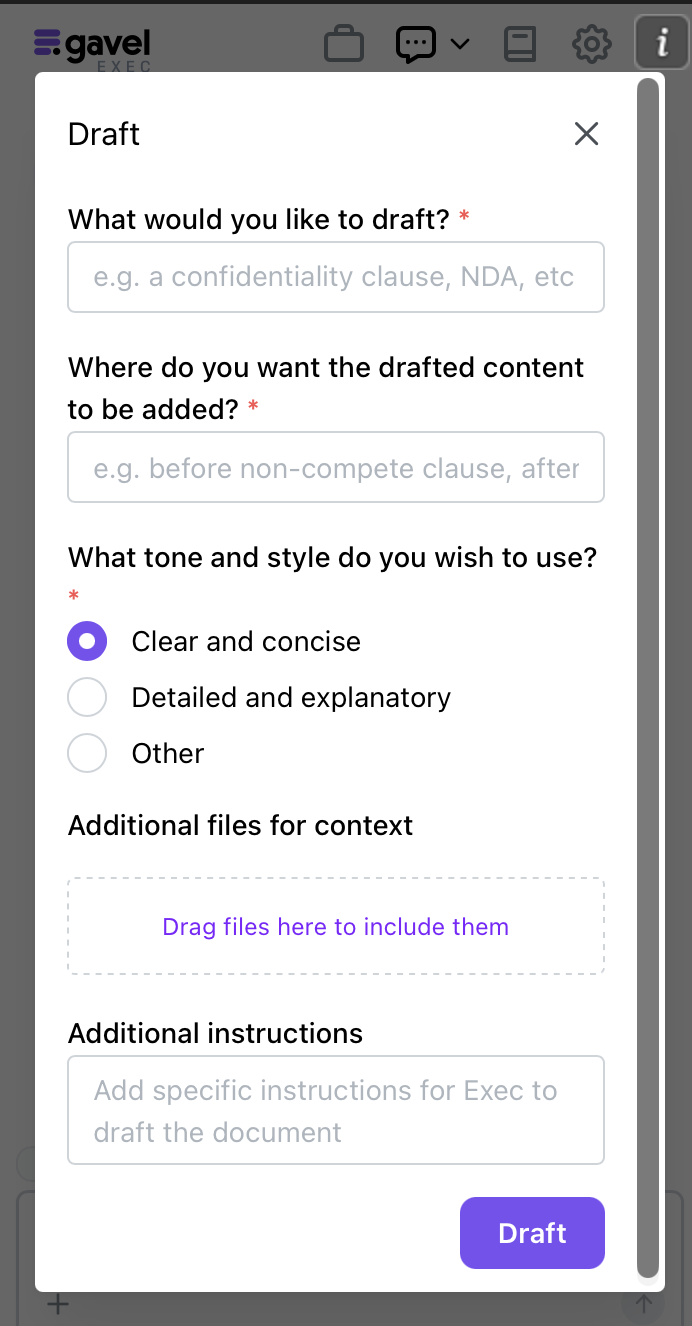 - Additional Files: Add files such as previous contracts, other context documents to give the Drafting Agent more information on your contract styles and needs.