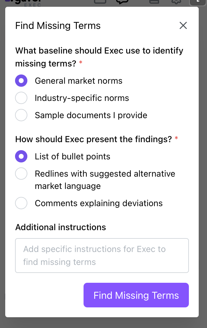 This Quick Action reviews and searches for missing terms that you set it to review throughout the contract or document.